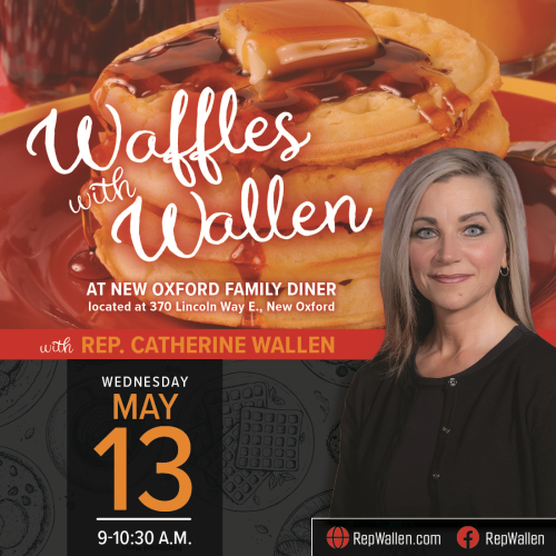 Rep. Catherine Wallen will host a Waffles with Wallen legislative breakfast for constituents on Wednesday, May 13, from 9-10:30 a.m. at the New Oxford Family Diner, located at 370 Lincoln Way E., New Oxford.